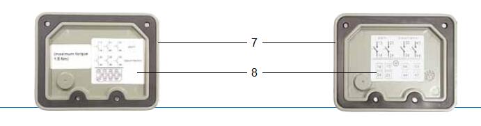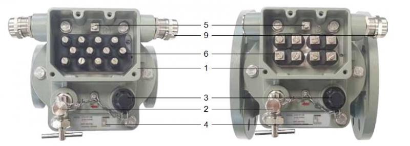 頂蓋是由耐氣候變化的鑄鋁合金制成,表層已涂色. 頂蓋部件上部有一個(gè)接線盒(圖4中1),在接線盒前面有一個(gè)放氣閥(圖4中2)和一個(gè)用悶蓋螺母(圖4中3)覆蓋的測(cè)試按鈕,同時(shí)上面還附有一個(gè)測(cè)試按鈕操作說(shuō)明標(biāo)牌(圖4中4). 接線盒中除了有一個(gè)接地點(diǎn)(圖4中5)外,頂蓋底板內(nèi)還裝有電力引線端子(圖4中6). 通過(guò)電力引線端子的數(shù)量可以決定涉及干簧管類(lèi)型與數(shù)量的開(kāi)關(guān)系統(tǒng)的布線配置.